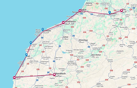 🕌 Day 1: Arrival in Fez – Welcome and relaxation "Calm before wonder." • Airport welcome and transfer to the riad 🏕 Overnight: Riad in Fez 🌆 Day 2: Fez – Treasures of the Medina "Living labyrinth, ancient knowledge." • Visit to the Attarine and Bouanania madrasas, Nejjarine fountain • Moulay Idriss mausoleum, Karaouine mosque • Panorama from the Marinid tombs 🏕 Overnight: Riad in Fez 🏛 Day 3: Fez – Meknes – Rabat "Palaces, stables, and ramparts." » • Discovery of Meknes: Medina, Jewish Quarter, Royal Stables • Route to Rabat: Royal Palace, Hassan Tower, Kasbah of the Oudayas 🏕 Overnight: Hotel in Rabat 🌊 Day 4: Rabat – Casablanca "Between history and modernity." • Mohammed V Square, Hassan II Mosque • Habous Quarter, Anfa and Ain Diab 🏕 Overnight: Hotel in Casablanca 🏞 Day 5: Casablanca – Essaouira via El Jadida & Oualidia "Fortresses, lagoons and pottery." • Stops in El Jadida, Oualidia and Safi • Arrival in Essaouira, a coastal town and bustling port 🏕 Overnight: Riad in Essaouira 🎪 Day 6: Essaouira – Marrakech "Flavors and shows." » • Route to Marrakech • Discover Jemaa El Fna Square and its entertainment 🏕 Overnight: Riad in Marrakech 🌺 Day 7: Marrakech – Gardens and Palaces "Minarets, palm trees, and souks." • Menara and Majorelle Gardens, Bahia Palace • Saadian Tombs, Koutoubia Mosque • Traditional dinner and show in the palm grove 🏕 Overnight: Riad in Marrakech ✈ Day 8: Departure – Last Minutes • Free time and transfer to the airport Customizable trip